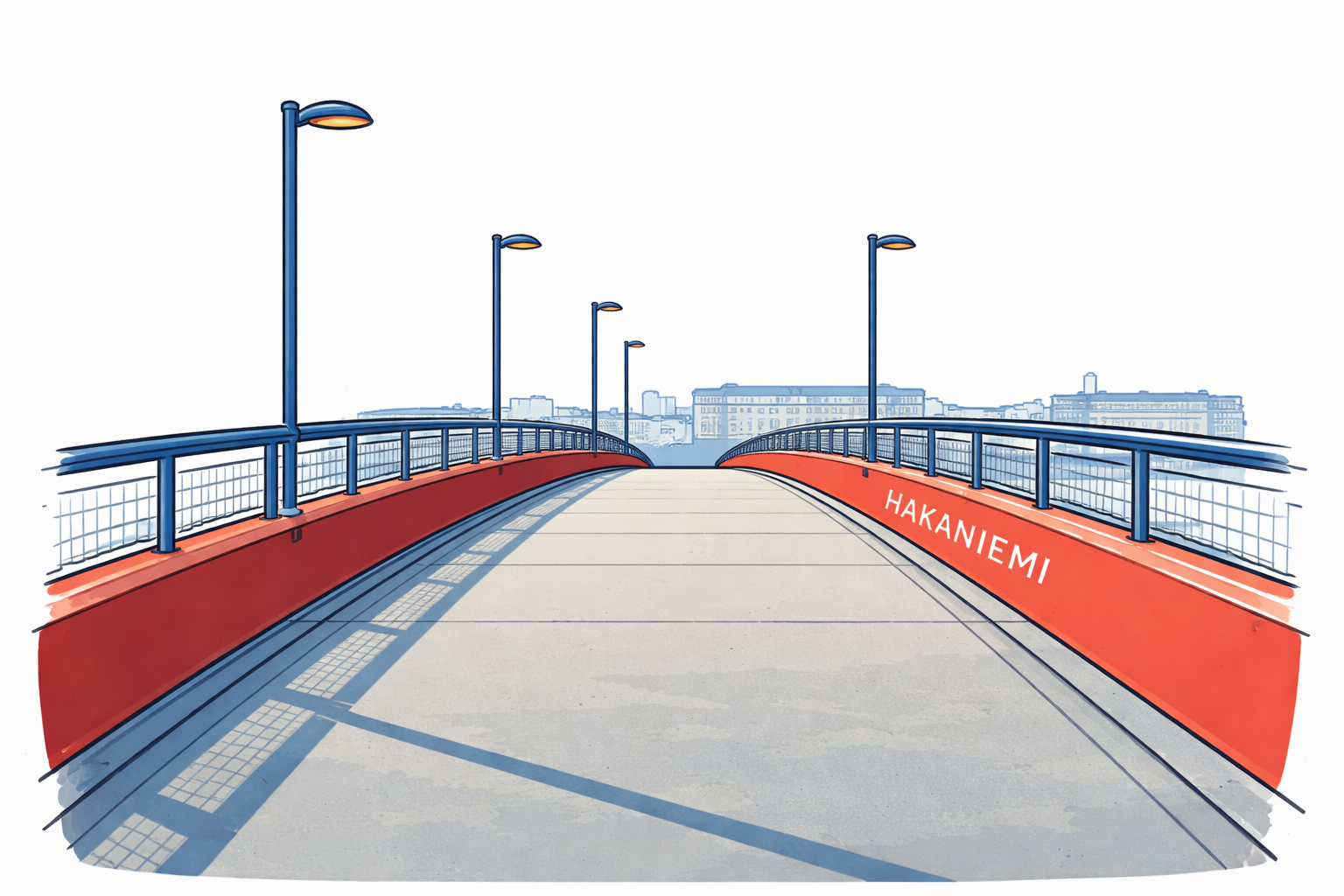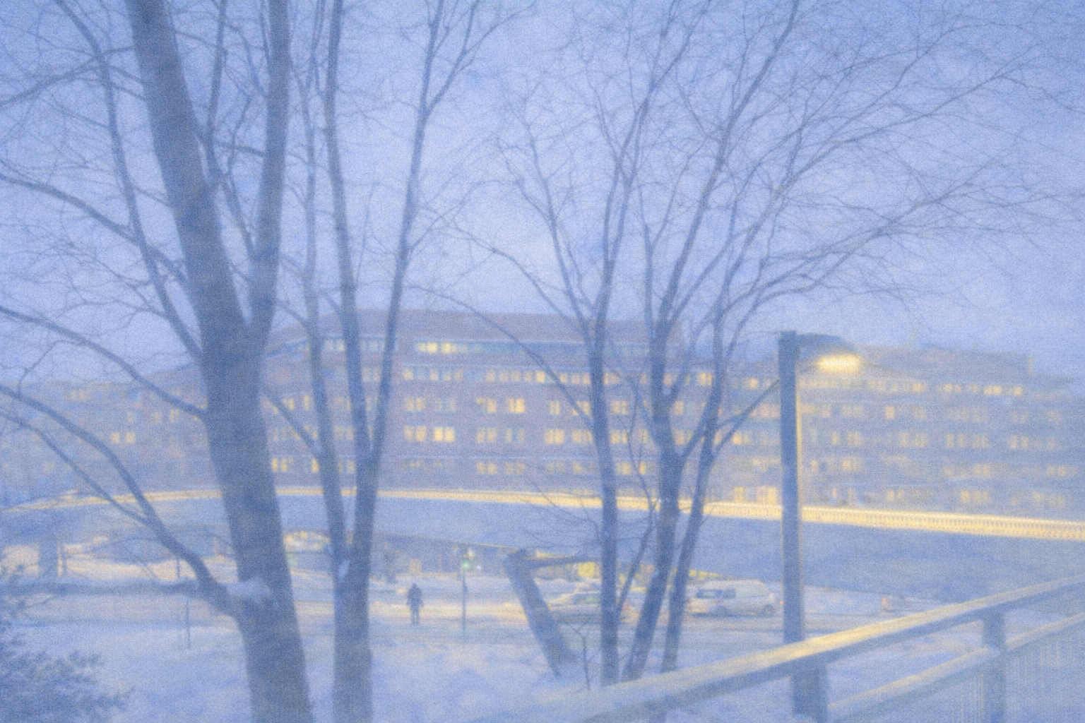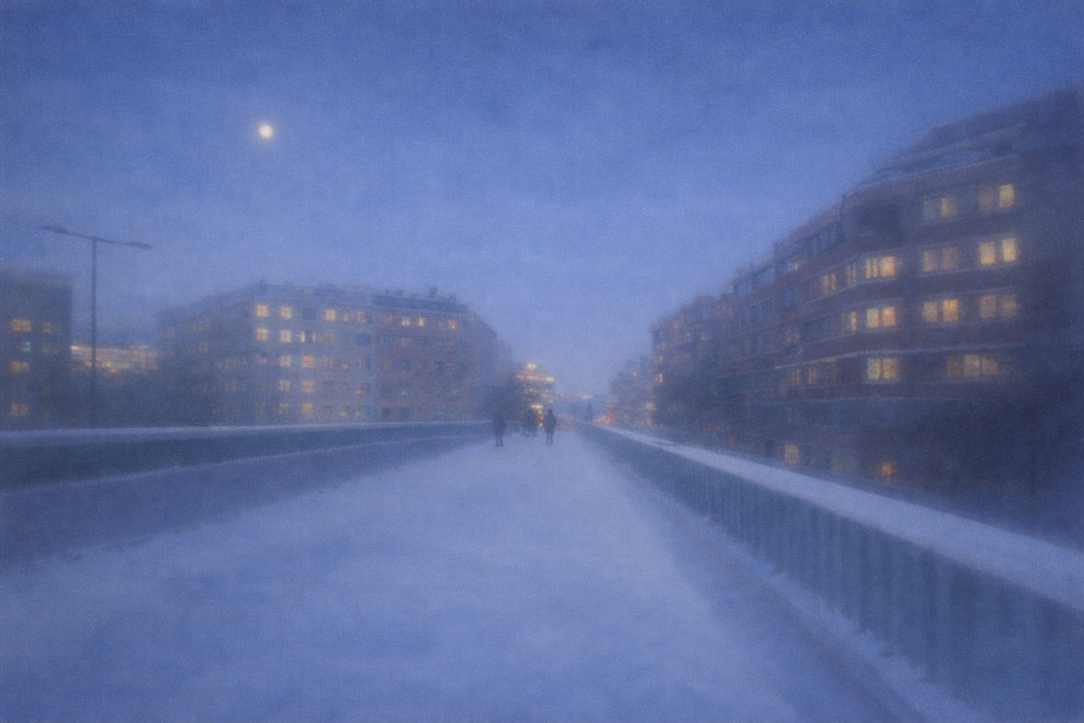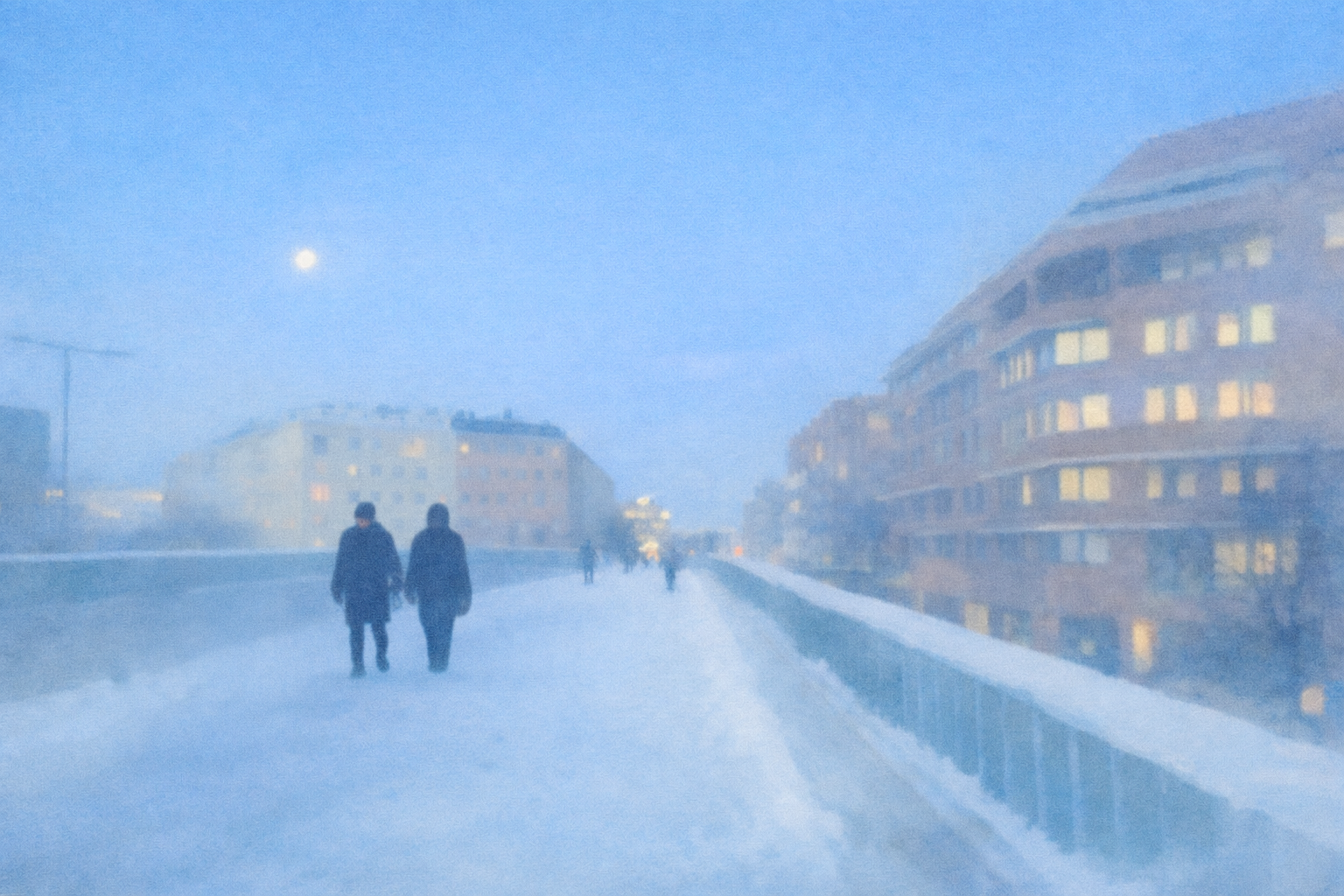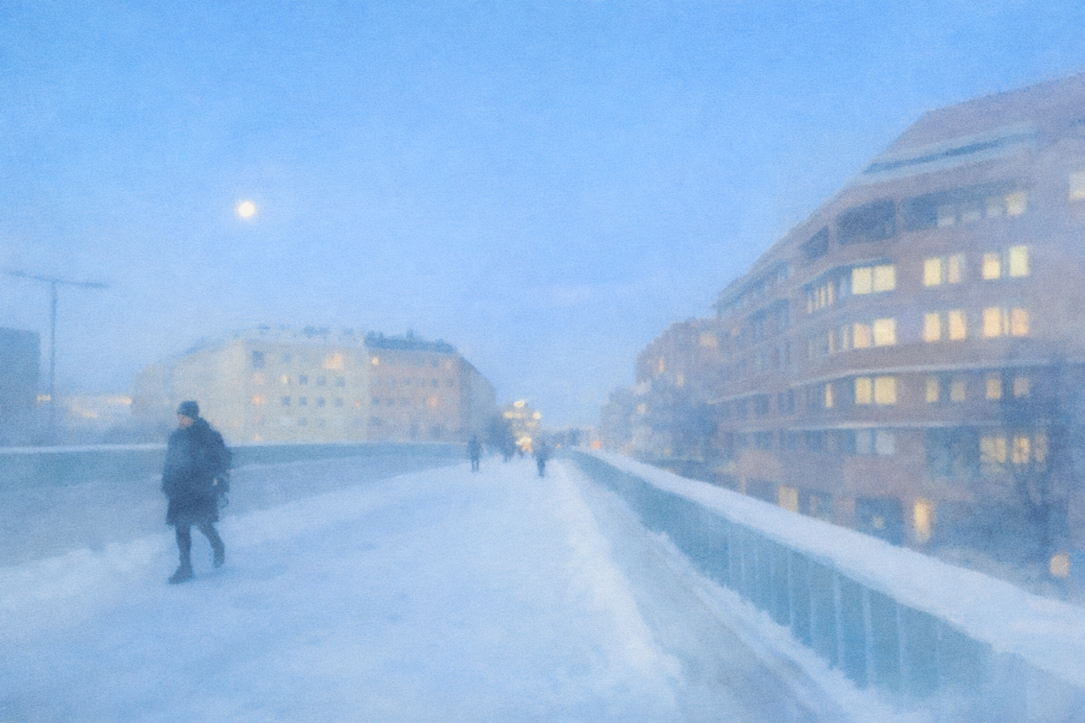 This project was inspired by a scene that I saw - From the early morning time I walk on an overbridge in Helsinki, everything is dark blue without light, the pedestrians wear thick clothes walk on the overbridge passing by me. And everything were covered by snow. I feel this scene has magic, seems like the truth is only under my foot, only the land that I have walked on with my feet is truly real.